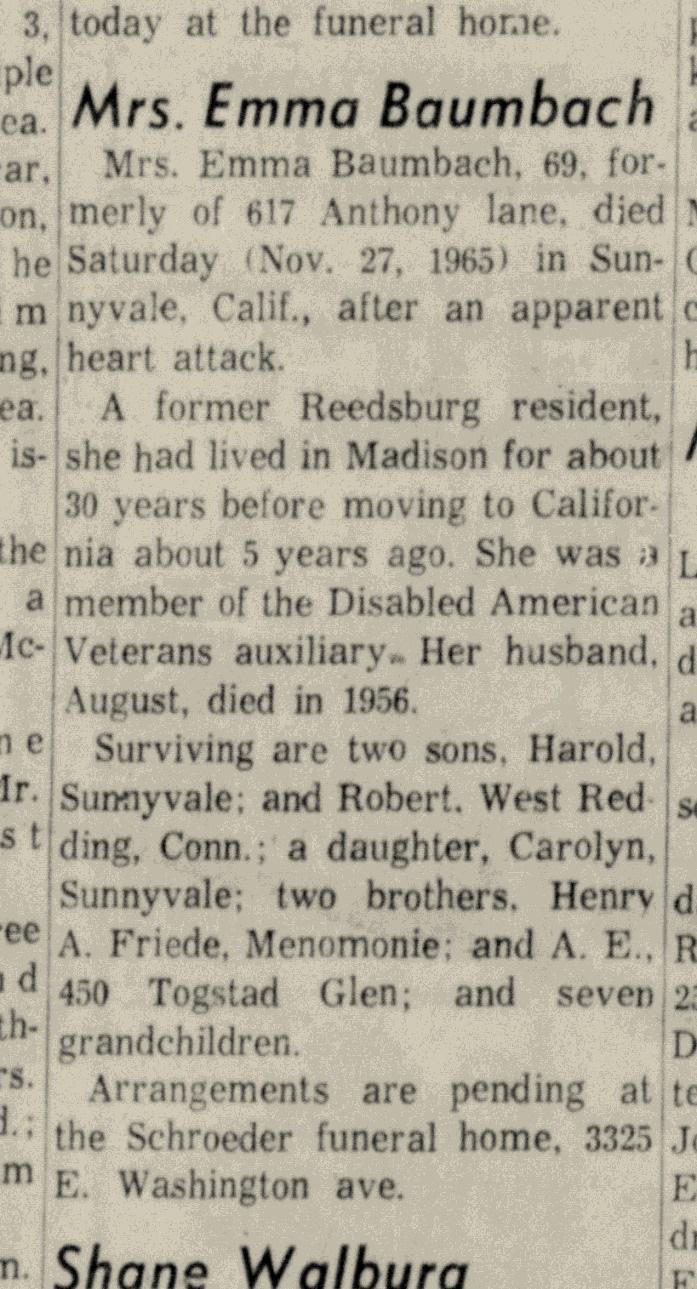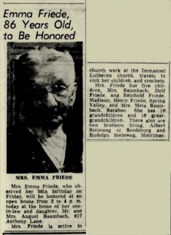 - Emma L. Friede+ b. 4 Dec 1895, d. 27 Nov 1965