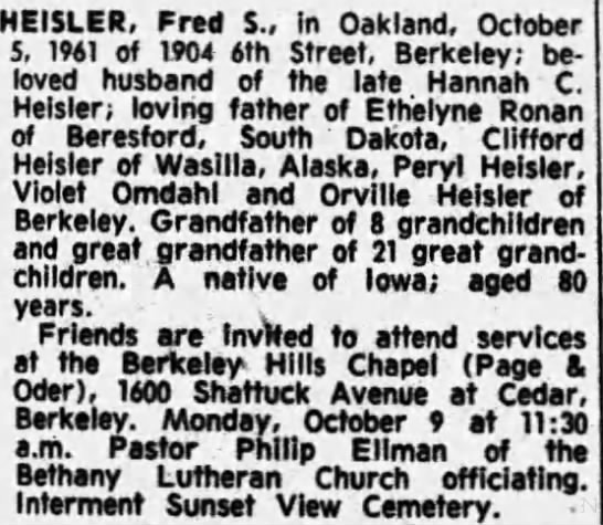- Orville L. Heisler b. 5 Sep 1918, d. 5 Aug 1971