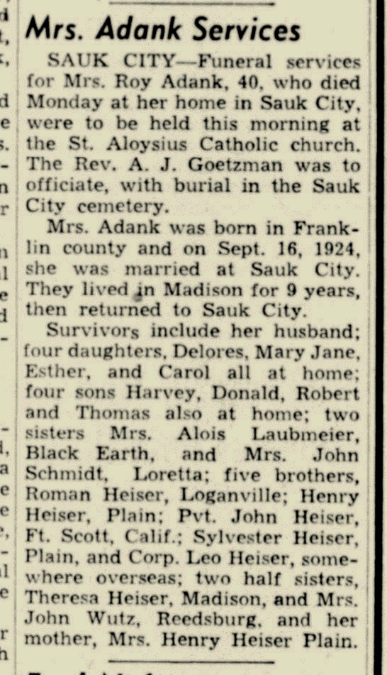 - [S373] U.S. Federal Census 1940 U.S. Federal Census, by Ancestry.com, Year: 1940; Census Place: Franklin, Sauk, Wisconsin; Roll: T627_4523; Page: 9A; Enumeration District: 56-14.