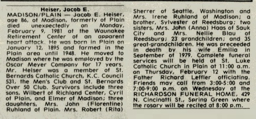 - Jacob E. Heiser+ b. 12 Jan 1895, d. 9 Feb 1981