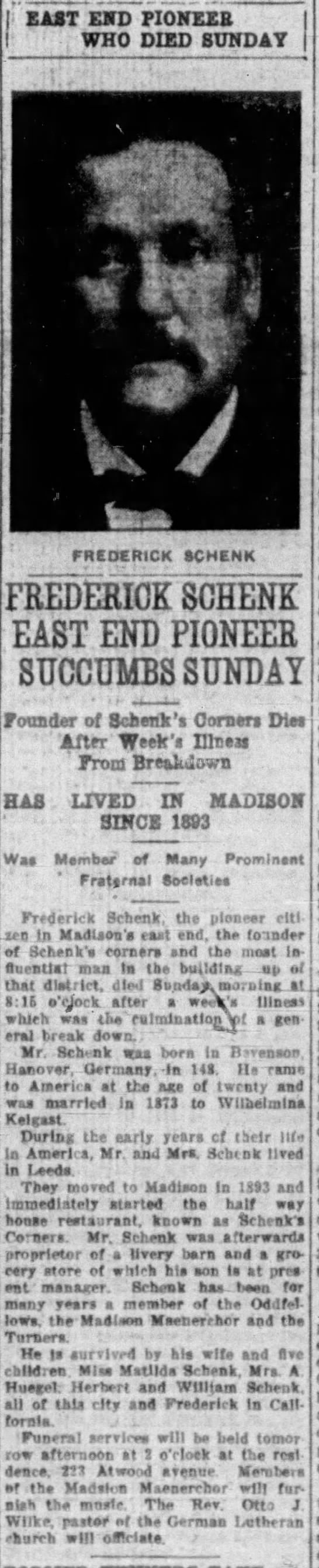 - Frederick Schenk b. 8 Mar 1848, d. 14 Sep 1913