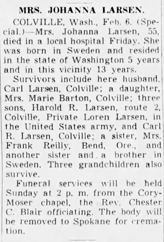 - Marie Larsen b. 30 Jan 1911, d. 1 Feb 1911