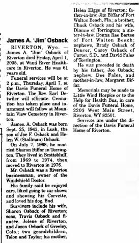 - James A. Osback+ b. 25 Sep 1943, d. 1 Apr 2005