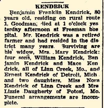 - Mace Kendrick b. 17 Nov 1893, d. 8 Sep 1950
