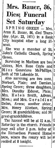 - [S243] U.S. Federal Census 1920 U.S. Federal Census, by Ancestry.com, Year: 1920;Census Place: Bear Creek, Sauk, Wisconsin; Roll: T625_2015; Page: 9A; Enumeration District: 160; Image: 24.