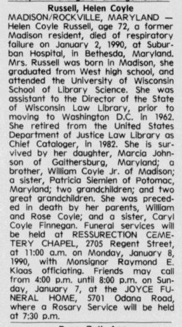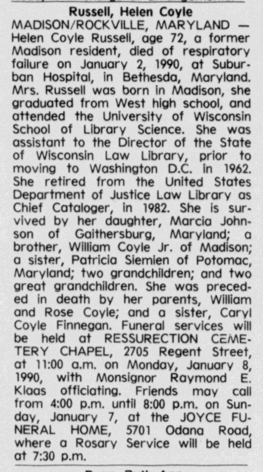 - Helen Kathleen Coyle+ b. 15 Mar 1917, d. 2 Jan 1990