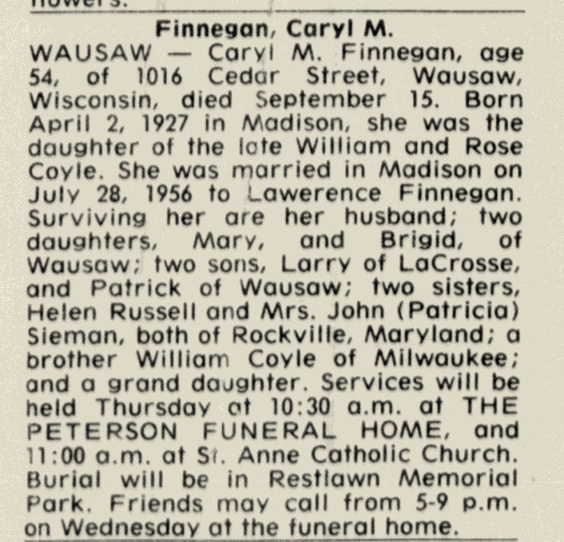 - Caryl Margaret Coyle+ b. 2 Apr 1927, d. 15 Sep 1981