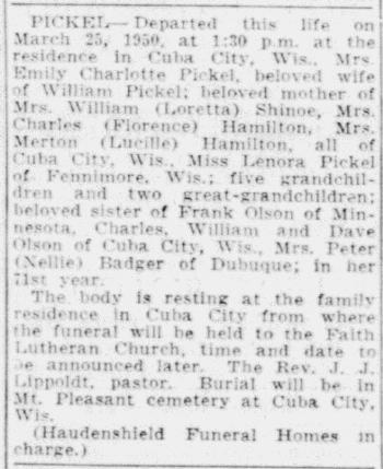 - Lucille Marie Pickel b. 31 Dec 1915, d. 1 Dec 2000