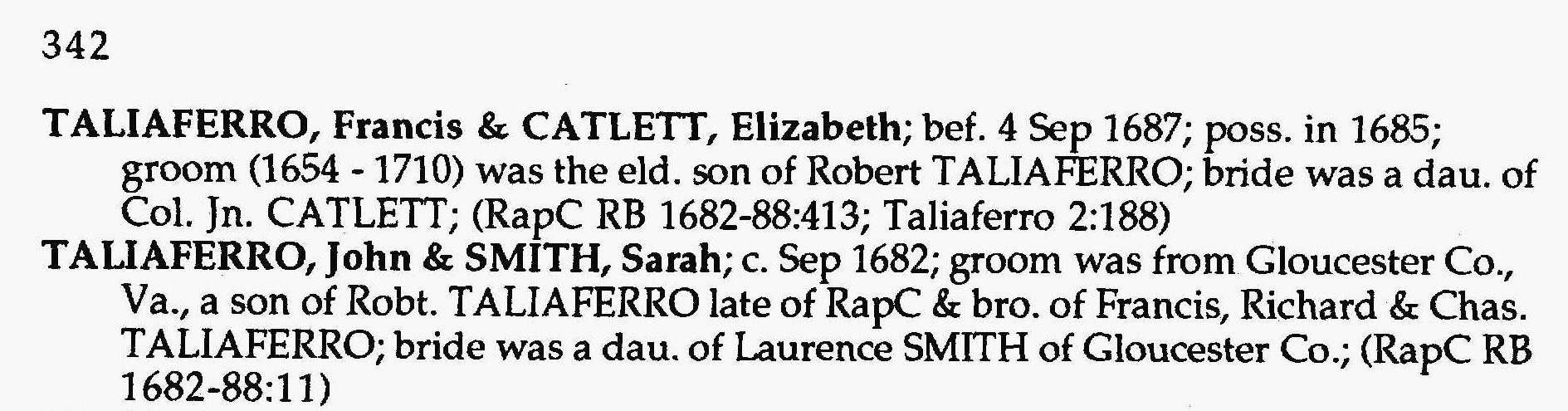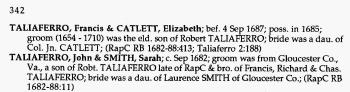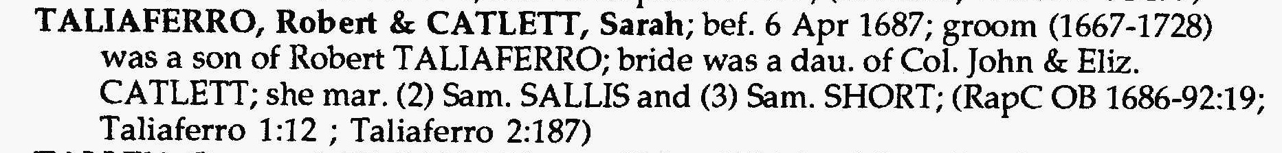 - Francis Taliaferro b. 1654, d. 1710