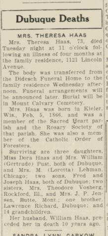 - Dorothea Margarette Haas b. 10 Jul 1886, d. 30 Nov 1943