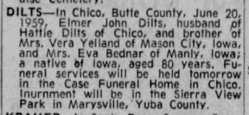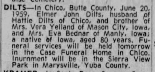 - Elmer John Dilts b. 20 Feb 1879, d. 20 Jun 1959