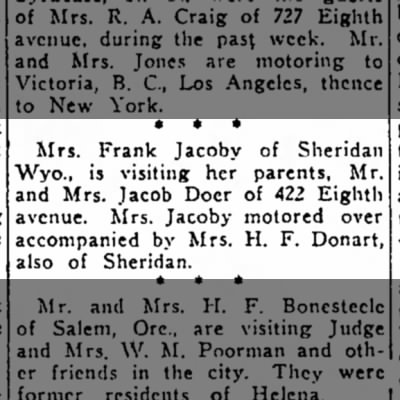 - [S244] U.S. Federal Census 1910 U.S. Federal Census, by Ancestry.com, Year: 1910; Census Place: Helena, Lewis and Clark, Montana; Roll: T624_833; Page: 7B; Enumeration District: 0160; FHL microfilm: 1374846.