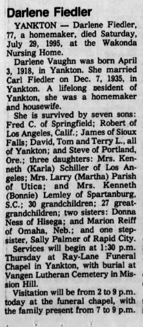 | Mother* | Selma Christine Fiedler b. 22 Aug 1896, d. 13 Feb 1995 |