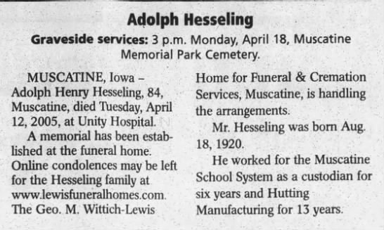 - Adolph Henry Hesseling b. 18 Aug 1920, d. 12 Apr 2005