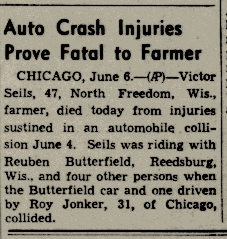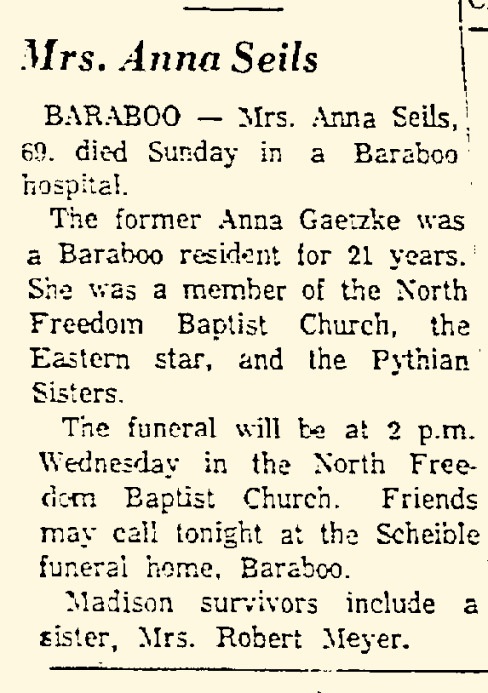 - [S244] U.S. Federal Census 1910 U.S. Federal Census, by Ancestry.com, Year: 1910; Census Place: Freedom, Sauk, Wisconsin; Roll: T624_1736; Page: 14A; Enumeration District: 0116; FHL microfilm: 1375749.