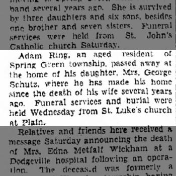 - [S250] U.S. Federal Census 1930 U.S. Federal Census, by Ancestry.com, Year: 1930; Census Place: Spring Green, Sauk, Wisconsin; Roll: 2609; Page: 5A; Enumeration District: 0034; Image: 438.0; FHL microfilm: 2342343.