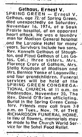 - Ernest V. Gelhaus+ b. 1902, d. 16 Nov 1974