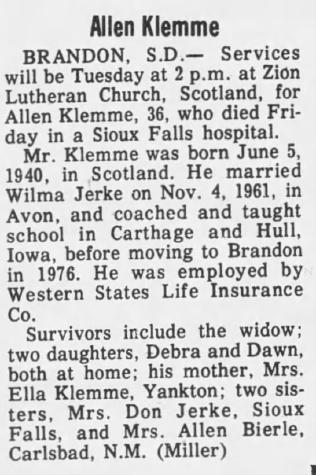 - Allen Klemme b. 5 Jun 1940, d. 31 Dec 1976