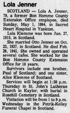- Lola Klemme b. 27 Jan 1915, d. 1 May 1994