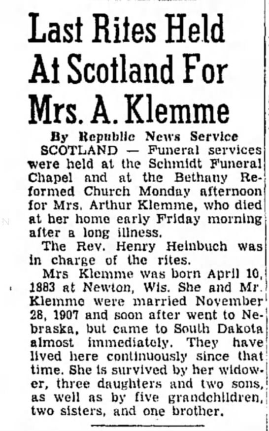 - Ruth Klemme b. 16 Feb 1911, d. 16 Jan 1979