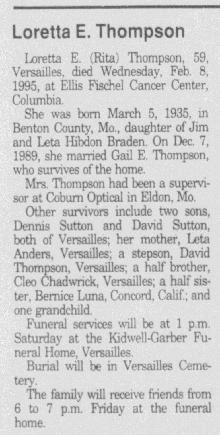 | Mother* | Leta Irene Hibdon b. 12 Sep 1917, d. 5 Jun 1999 |