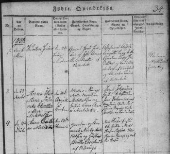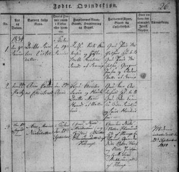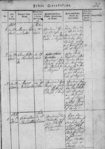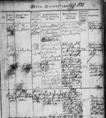 - [S383] The Danish National Archives; Church Records, Ane Johanne Nielsdatter birth record, Page 6 Image 7, Kontraministerialbog (1814 - 2002) Denmark.