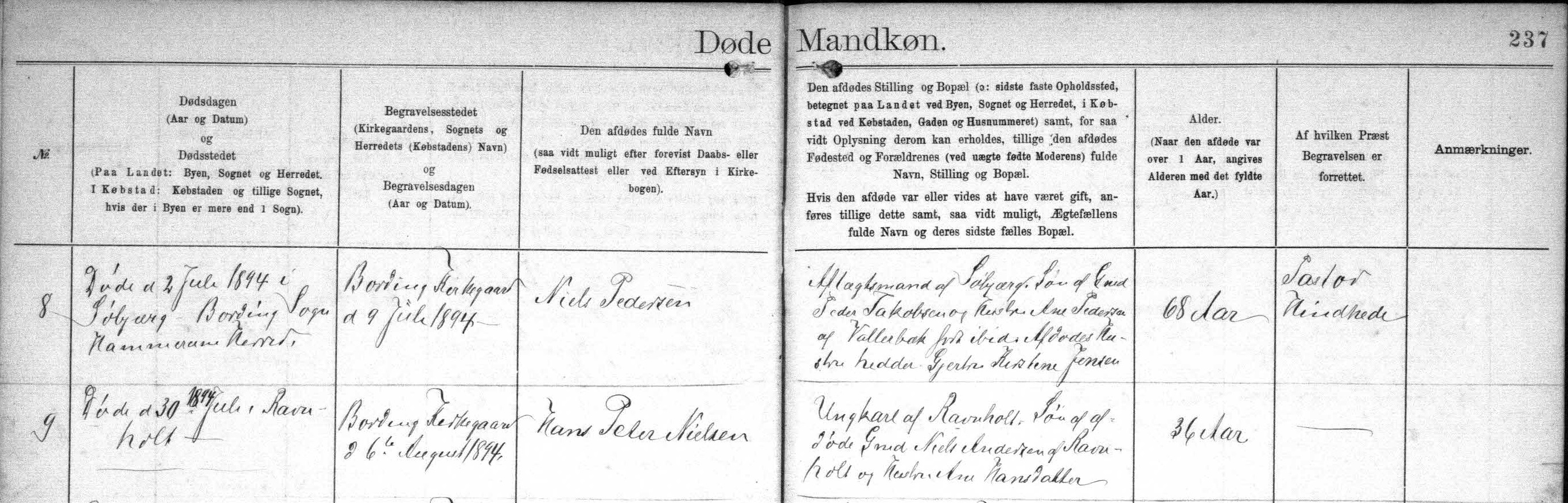 - [S383] The Danish National Archives; Church Records, Niels Pedersen death record - 2 July 1894 - Bording, Hammerum, Ringkjøbing, Denmark.
