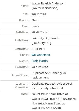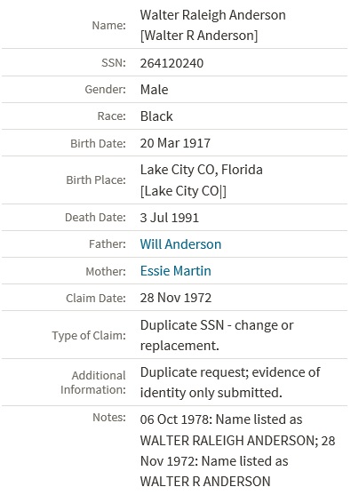 - Walter Raleigh Anderson Sr.+ b. 20 Mar 1917, d. 3 Jul 1991