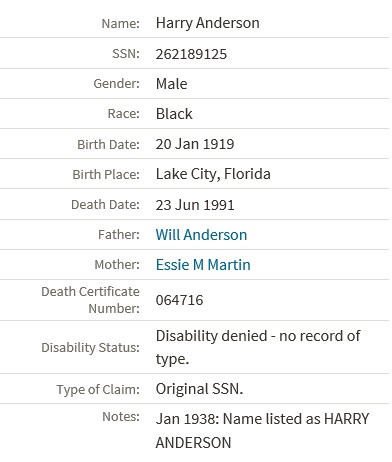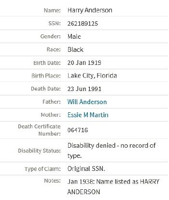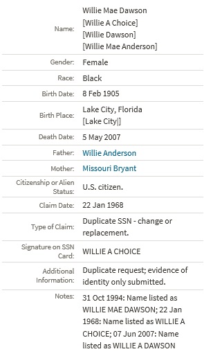 | Mother* | Willie Mae Anderson b. 8 Feb 1905, d. 5 May 2007 |
