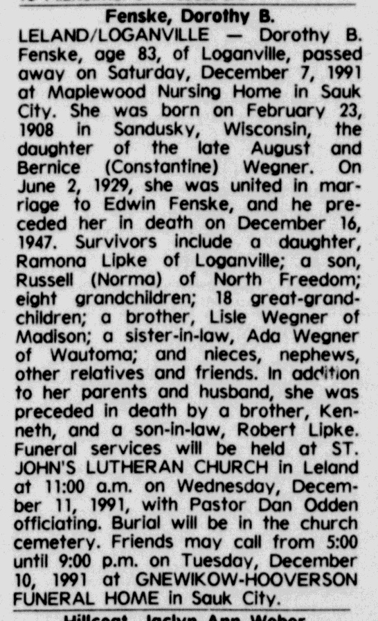 | Father* | August B. Wegner b. 1882, d. 5 Oct 1939 |