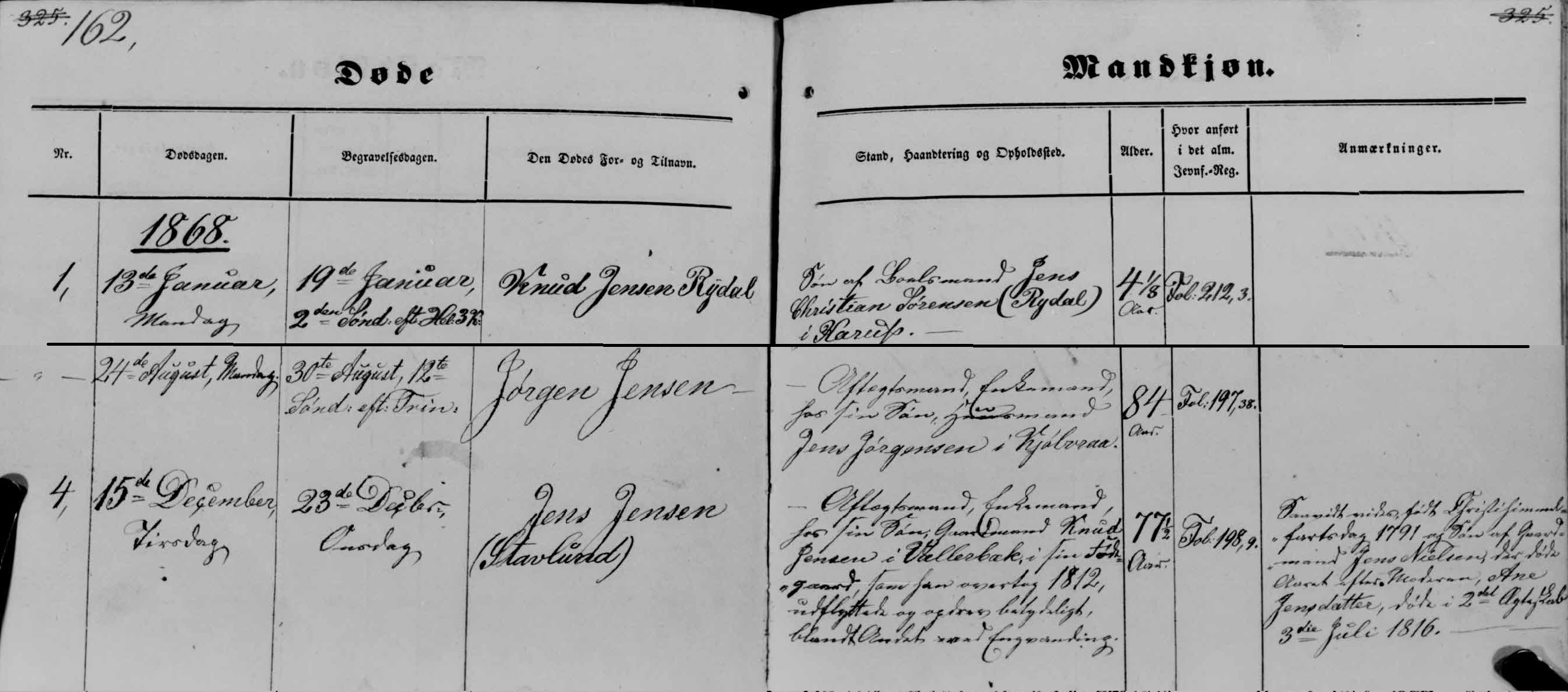- [S383] The Danish National Archives; Church Records, Jens Jensen death record - 15 Dec 1868 - Karup, Lysgaard, Viborg, Denmark.
