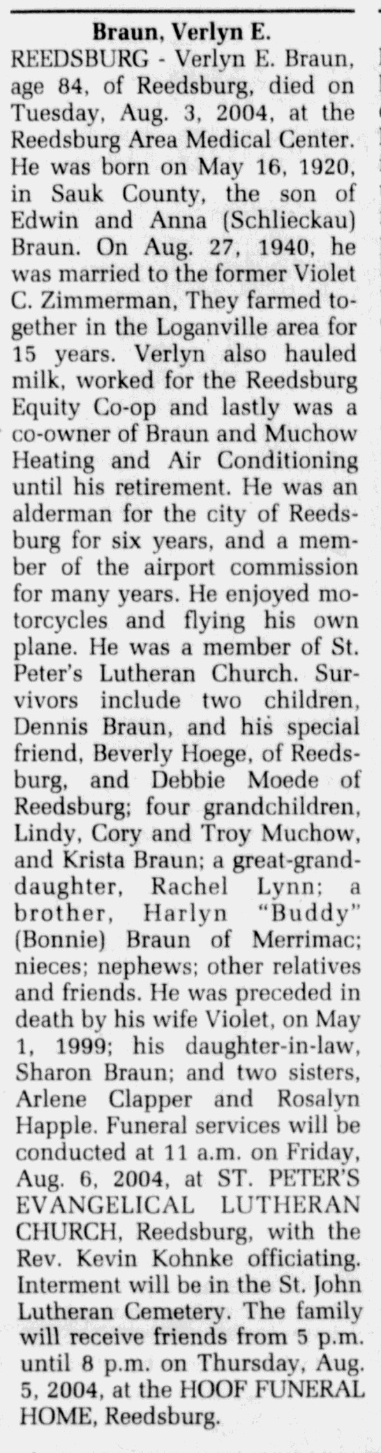 - Verlyn Edwin Braun+ b. 16 May 1920, d. 3 Aug 2004