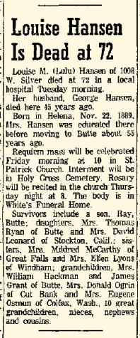 - [S373] U.S. Federal Census 1940 U.S. Federal Census, by Ancestry.com, Year: 1940; Census Place: Butte, Silver Bow, Montana; Roll: m-t0627-02230; Page: 4B; Enumeration District: 47-32.