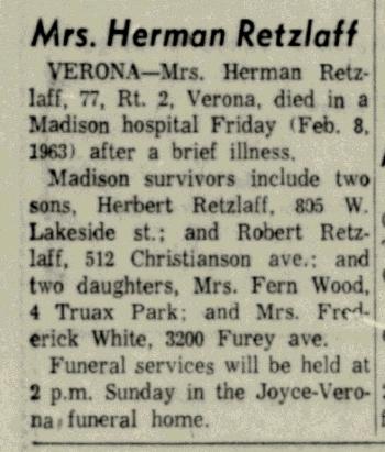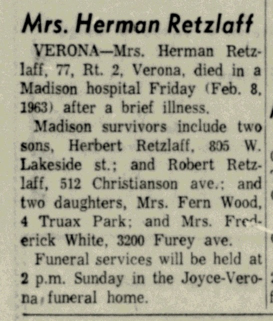 - Maxentia Fern Retzlaff b. 5 Jan 1932, d. 6 Mar 2019