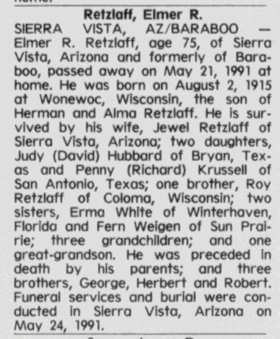 - Elmer Rienhold Retzlaff+ b. 2 Aug 1915, d. 21 May 1991