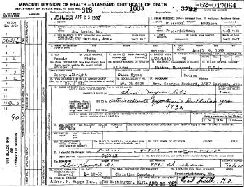 - [S373] U.S. Federal Census 1940 U.S. Federal Census, by Ancestry.com, Year: 1940; Census Place: Fredericktown, Madison, Missouri; Roll: T627_2127; Page: 1A; Enumeration District: 62-10.