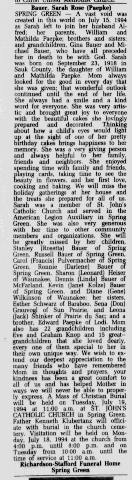 - Sarah Rose Paepke+ b. 23 Sep 1918, d. 15 Jul 1994