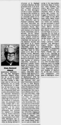 - Reverand Monsignor Raymond Edward Klaas b. 16 Aug 1926, d. 15 Oct 2008