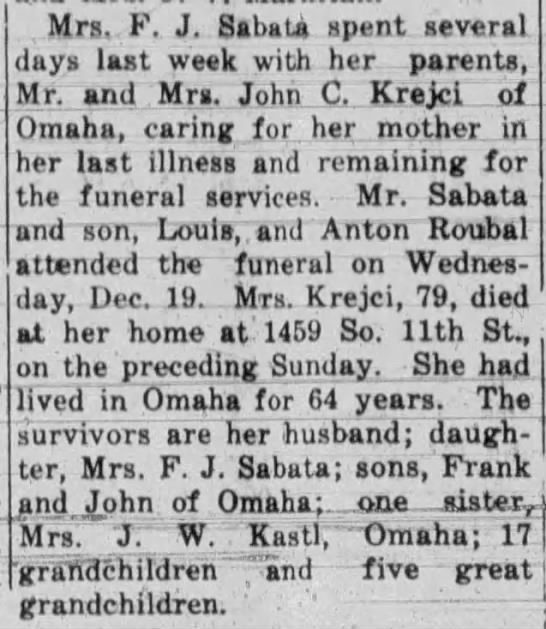 - Anna Krejci b. 9 Jun 1870, d. 17 Aug 1947