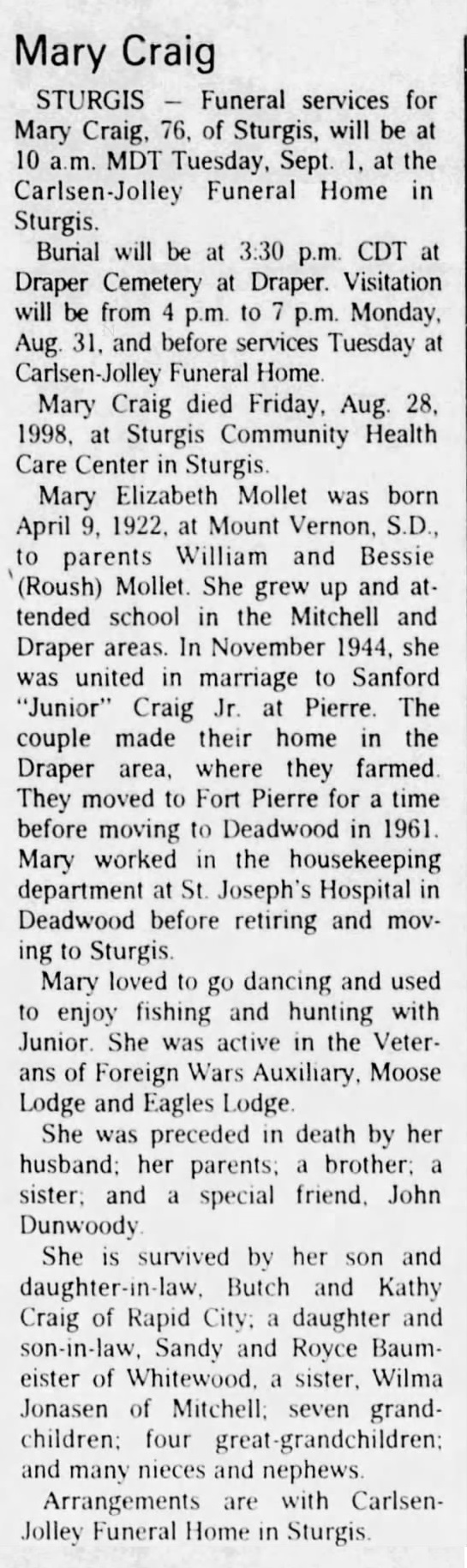 - Mary Elizabeth Mollet+ b. 9 Apr 1922, d. 28 Aug 1998