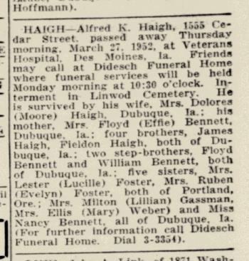 - [S373] U.S. Federal Census 1940 U.S. Federal Census, by Ancestry.com, Year: 1940; Census Place: Dubuque, Dubuque, Iowa; Roll: m-t0627-01159; Page: 13A; Enumeration District: 31-51.