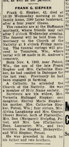 | Father* | Frank G. Siepker b. 4 Nov 1903, d. Apr 1946 |