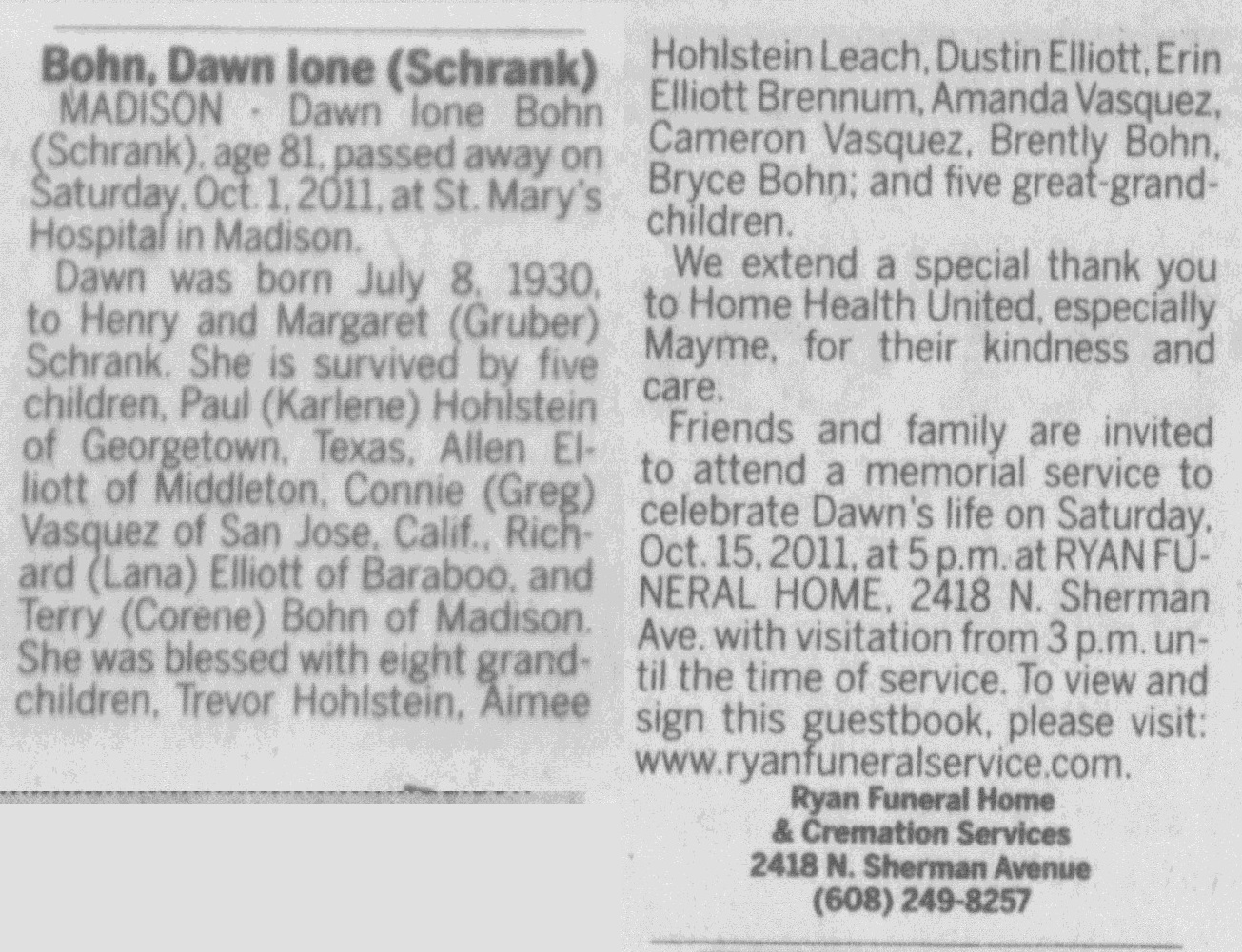 | Mother* | Frona P. Schuette b. 1901, d. 1975 |