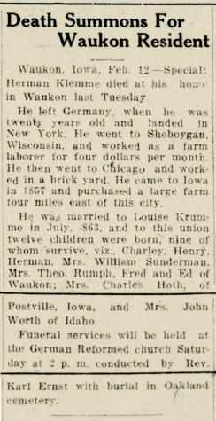 - Herman Frederick Klemme b. 8 Feb 1866, d. 2 Sep 1936