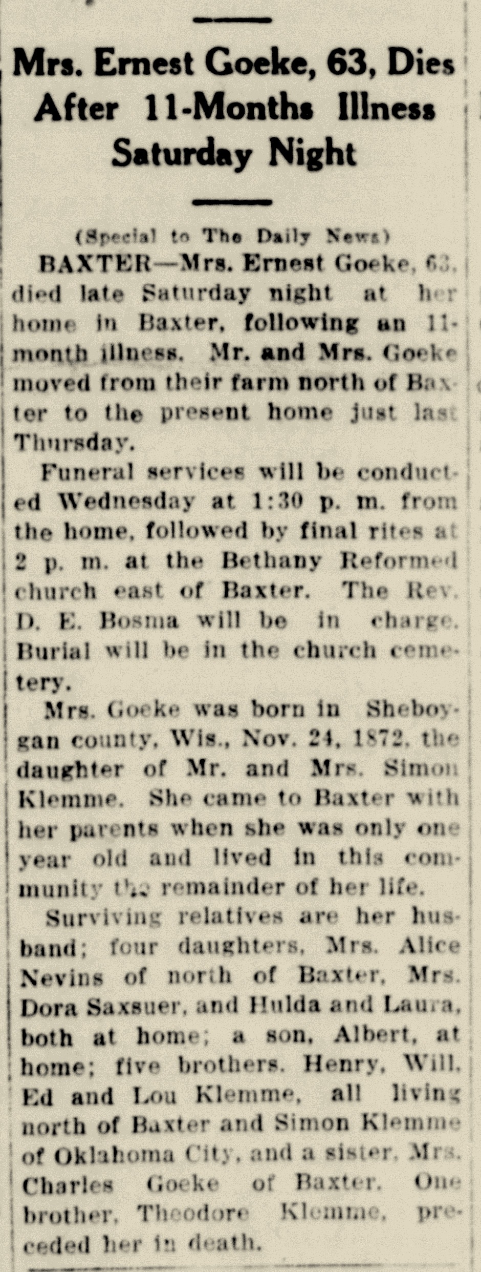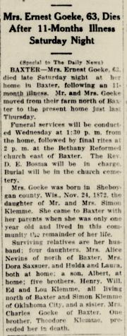 - Caroline Bertha Klemme b. 4 Jul 1871, d. 22 Oct 1946