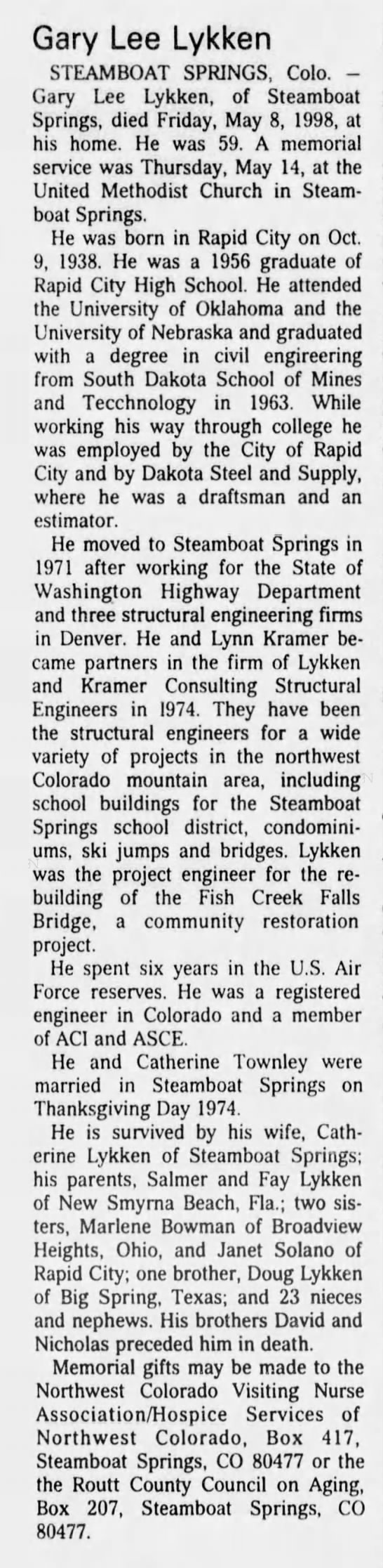 - Gary Lee Lykken b. 9 Oct 1938, d. 8 May 1998