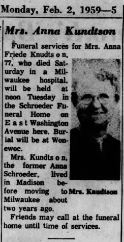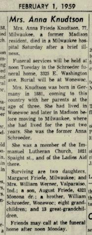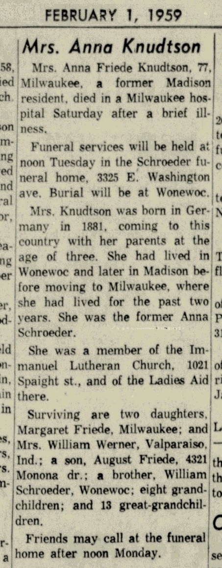 | Mother* | Anna M. Schroeder b. 5 Aug 1881, d. 31 Jan 1959 |