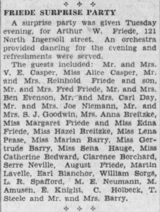 | Father* | Frederich J. Friede b. 12 Jan 1877, d. 1 Mar 1930 |