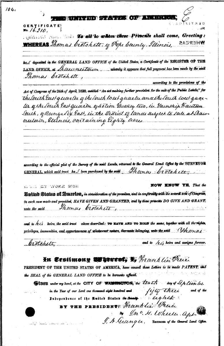 - [S261] Land Office Records Land Patent Record, by Bureau of Land Management, Accession/Serial #: IL1880__.104 BLM Serial #: IL NO S/N.