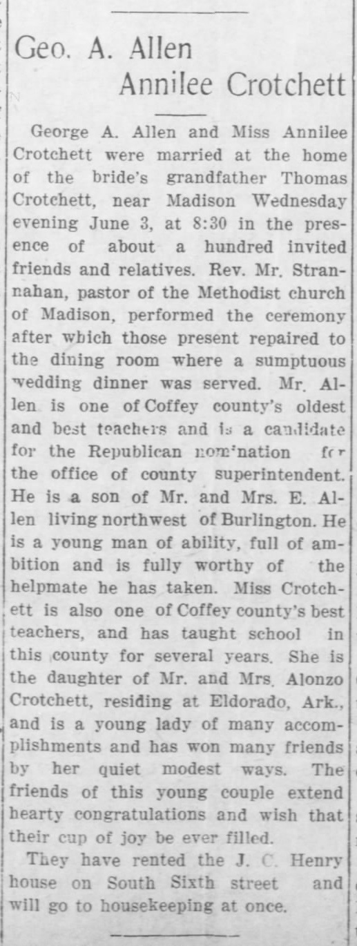 - Jannette Allen Crotchett+ b. 30 Oct 1879, d. 11 Oct 1961